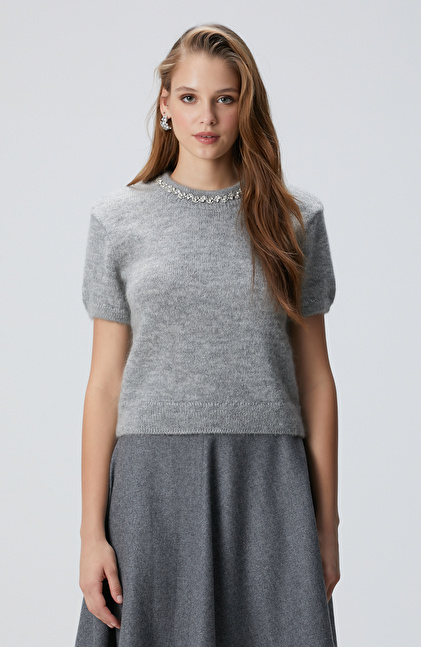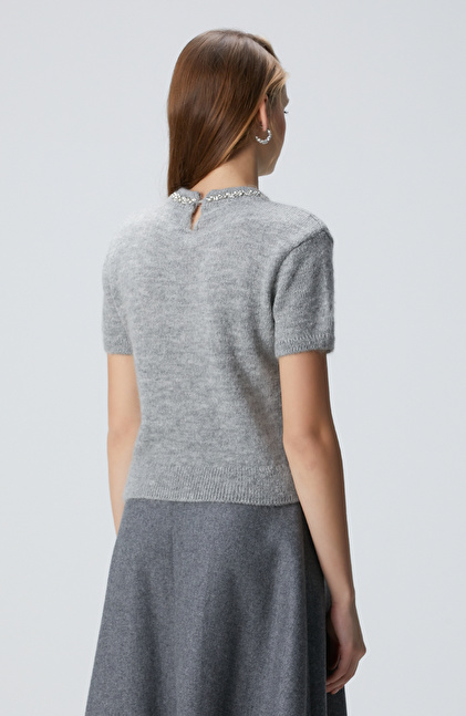 Regular Fit; Bisiklet Yaka; Kısa Kol; Triko Kazak; Yakası Taşlı