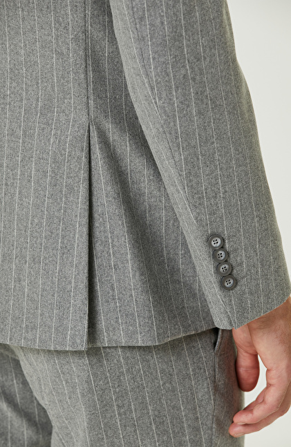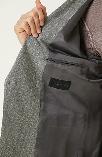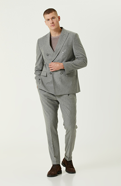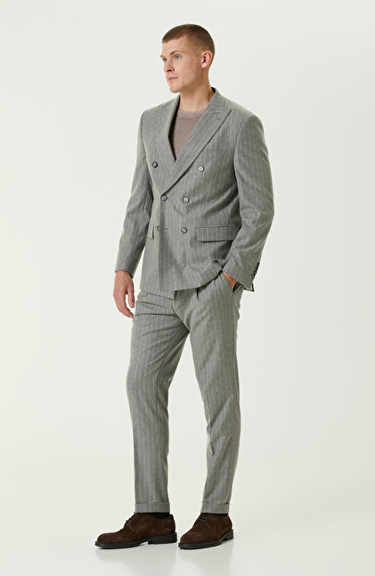 Comfort Fit. Çizgi Desenli, Yün Karışımlı, Flanel Takım Elbise. Ceket: Kruvaze Yaka, Uzun Kol. Pantolon: Normal Bel, Düz Paça, Fleto Cepli