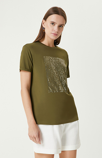 Basic Fit; Bisiklet Yaka; Geometrik Çamur Varak Baskılı; Kısa Kol T-Shirt