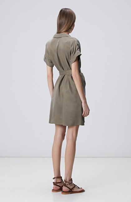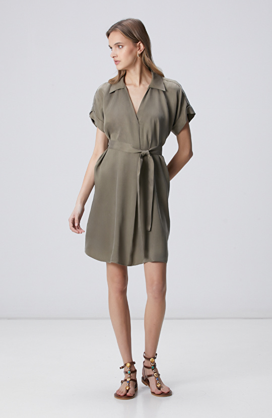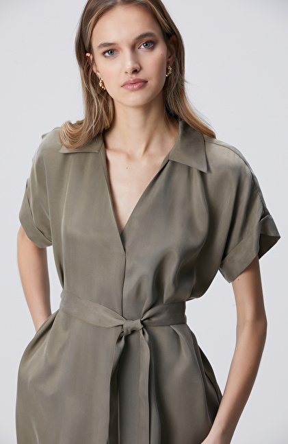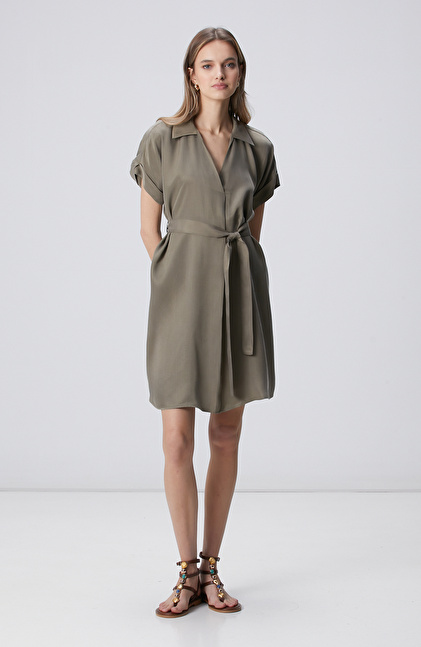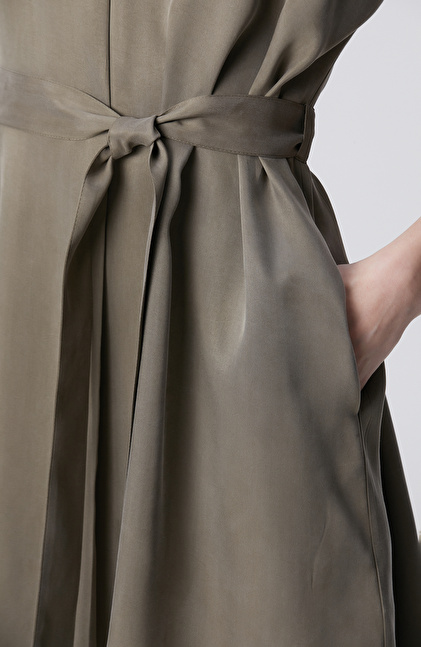 Haki Beli Kuşaklı Midi Cupro Elbise