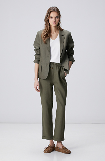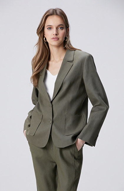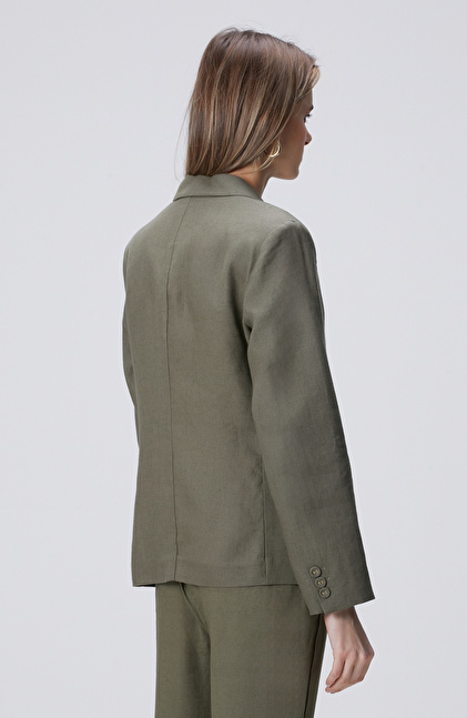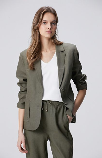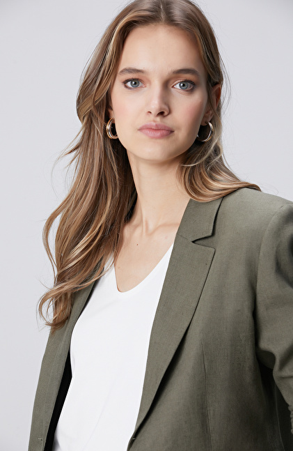 Haki Cep Detaylı Keten Ceket