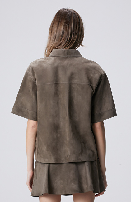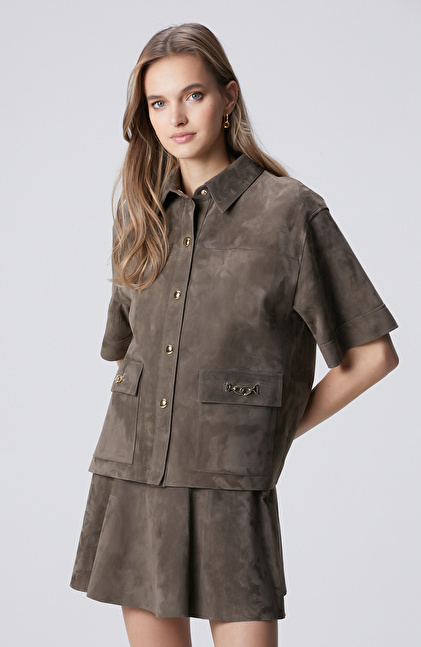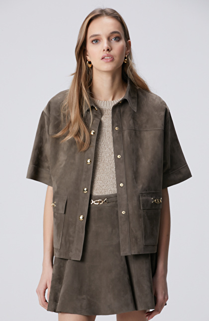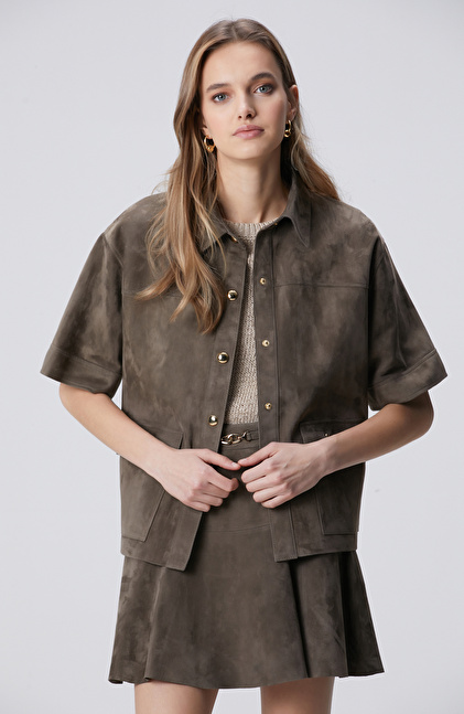 Haki Cepleri Aksesuarlı Süet Deri Mont