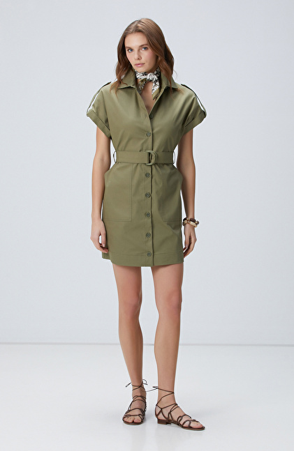 Basic Fit; Gömlek Yaka; Kısa Kol; Diz Boy; Safari Elbise; Apoletli; Cepli