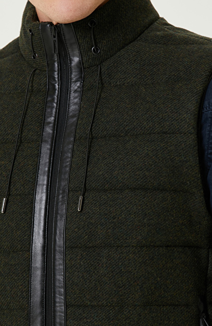 Comfort Fit; Dik Yaka; Kolsuz; Yün Karışımlı; Flanel Casual Yelek; Ön Patta Deri Detaylı; Yan Cepleri Fermuarlı