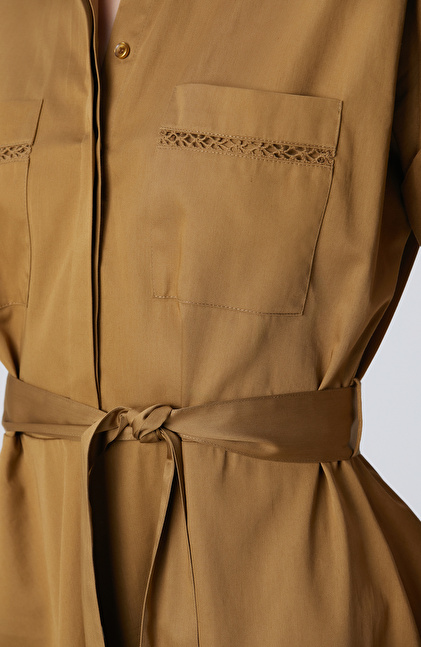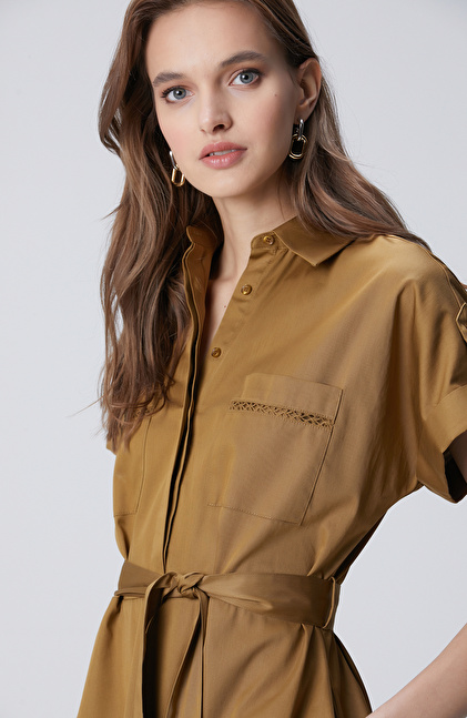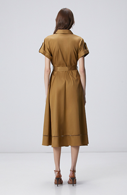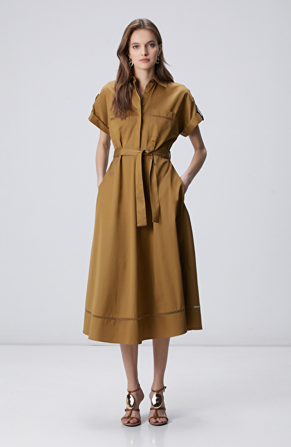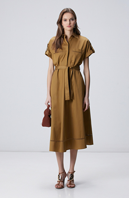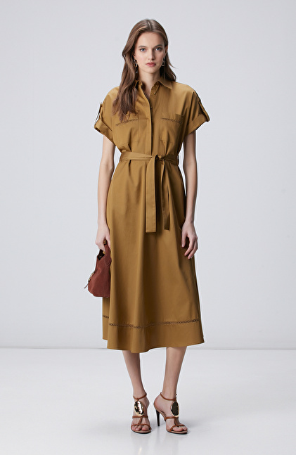Hardal Cepli Kuruşeta Detaylı Midi Elbise