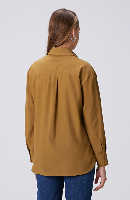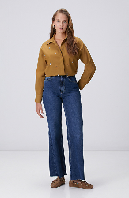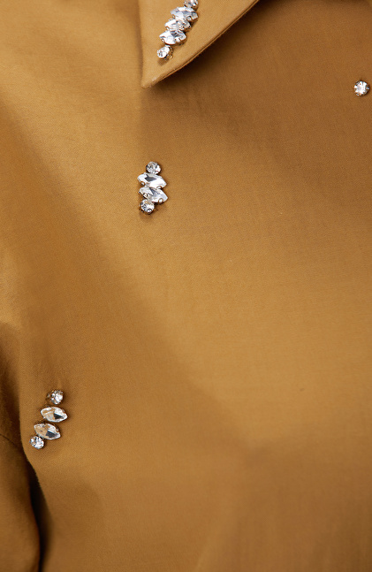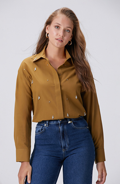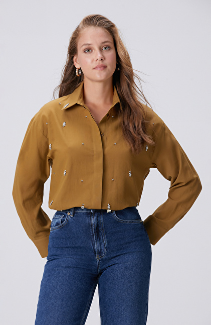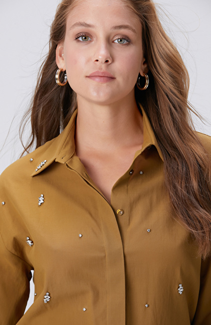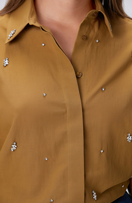 Hardal Dağınık Taş İşlemeli Cepli Uzun Kol Gömlek
