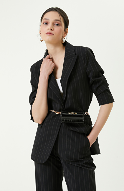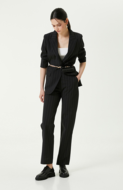 NetWork'ün zamansız ve entelektüel kadınlar için tasarladığı İki Düğmeli Siyah Blazer Ceket, lüks ve zamansız tasarım detaylarıyla business kombinleri için mükemmel bir seçimdir. Çizgili dizaynı retro ve modern kombinlere uyum sağladığı için her zaman moda trendlerine uygun kombinler yapabilirsiniz. Ceket yakası, regular fit kalıbı ve uzun kolları ile farklı gömlek, triko kazak, bluz modelleriyle kolaylıkla eşleştirilebilir. İki düğmeli blazer ceket, fit ve şık görünümünüzü destekler, kumaş dar ya da bol paça pantolonlarla giyebilirsiniz. Siyah blazer ceketi; ekru saten gömlek, ekru mini etek, siyah topuklu loafer ve deri omuz çantalarıyla kombinleyebilir, kış aylarına uygun iş görünümleri elde edebilirsiniz.