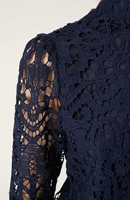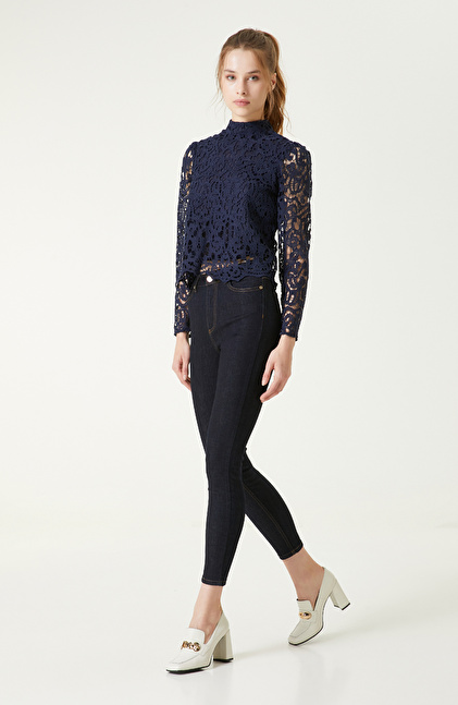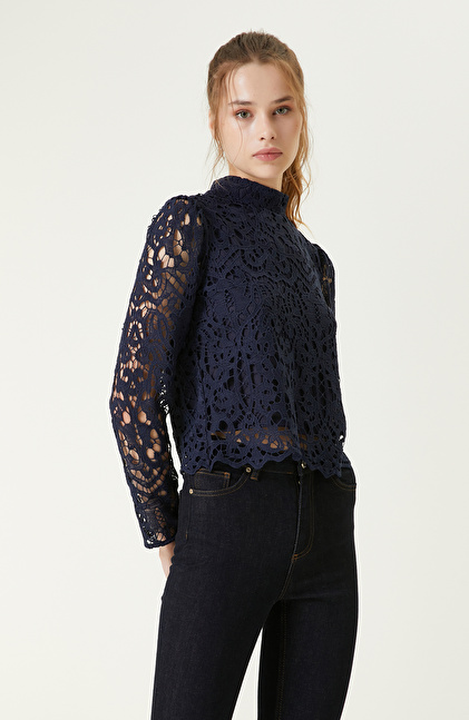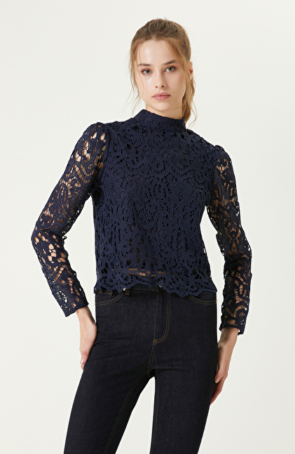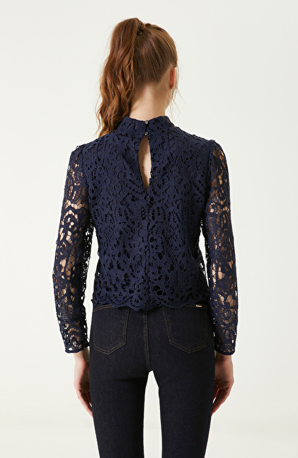 İndigo Dik Yaka Güpürlü Bluz