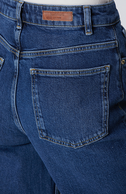İndigo Geniş Paça Detaylı Denim Pantolon
