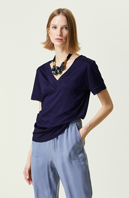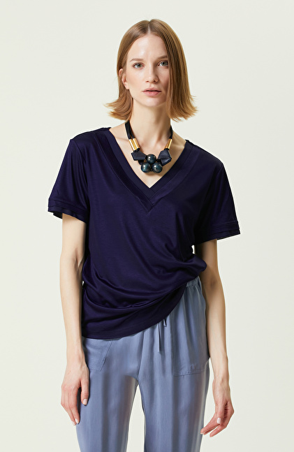 NETWORK Smart Casual İndigo Kısa Kollu V Yaka T-Shirt