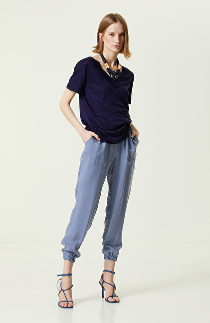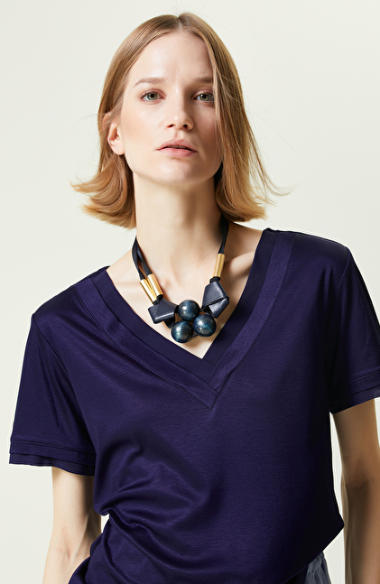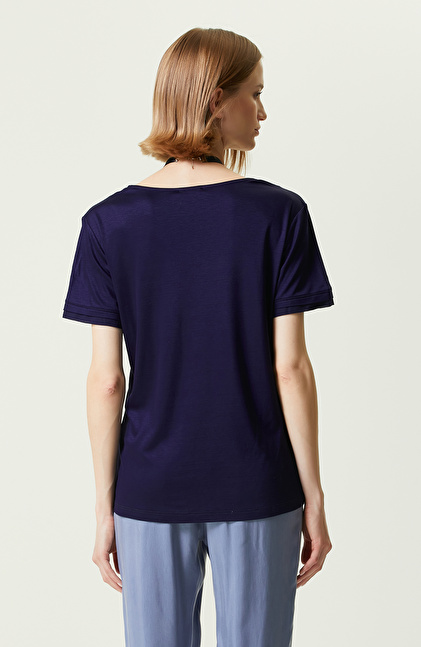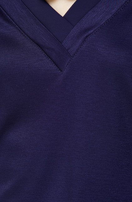 Düz İndigo Renk;Penye Kumaş;V Yaka;Kol Ucu Ve Yaka Şifon Garnili Kısa Kol;Slim Fit