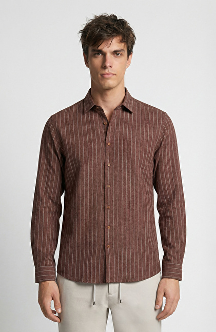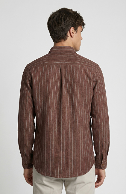 Kahverengi Çizgi Desenli Comfort Keten Gömlek
