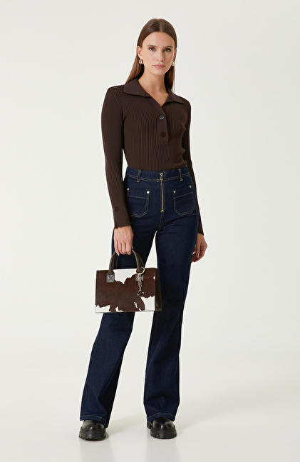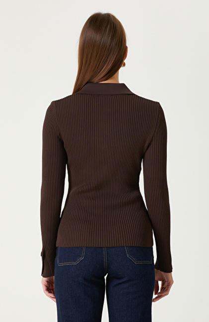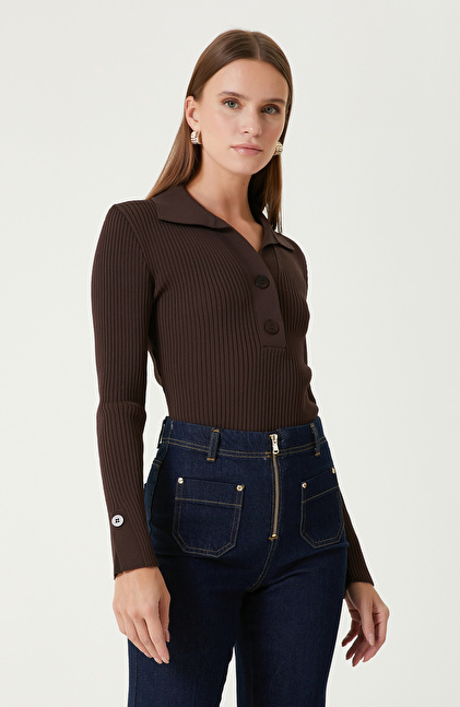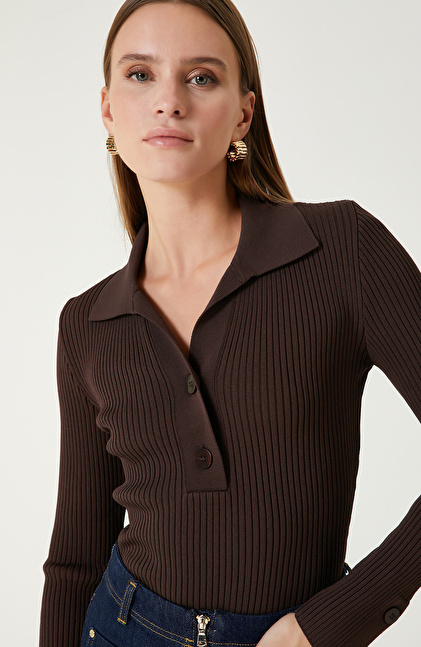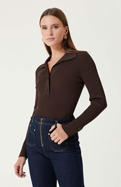 Kahverengi Düğme Detaylı Triko Kazak