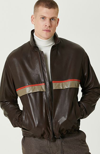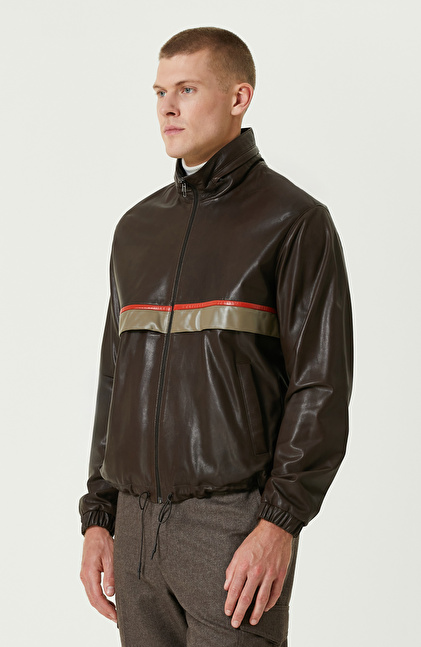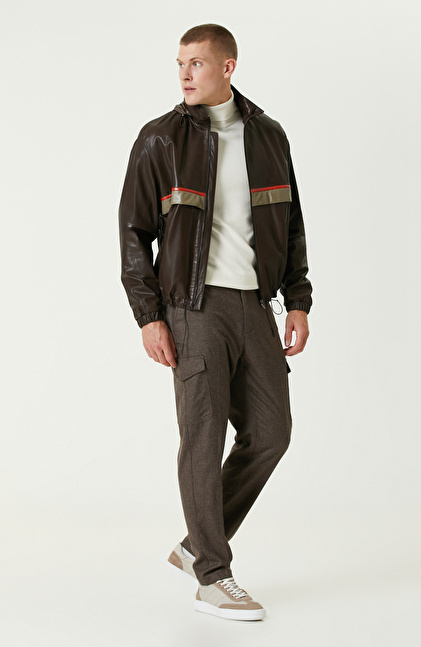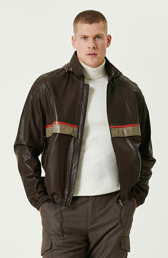 Kahverengi Gizli Kapüşonlu Bomber Deri Mont