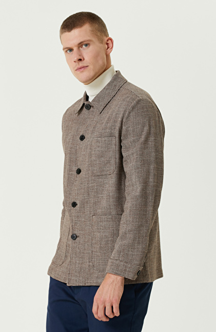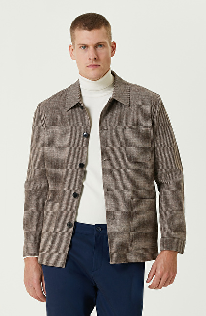 Comfort Fit; Gömlek Yaka; Uzun Kol; Pamuk Keten Karışımlı Ceket; Kazayağı Desenli; Aplike Cepli