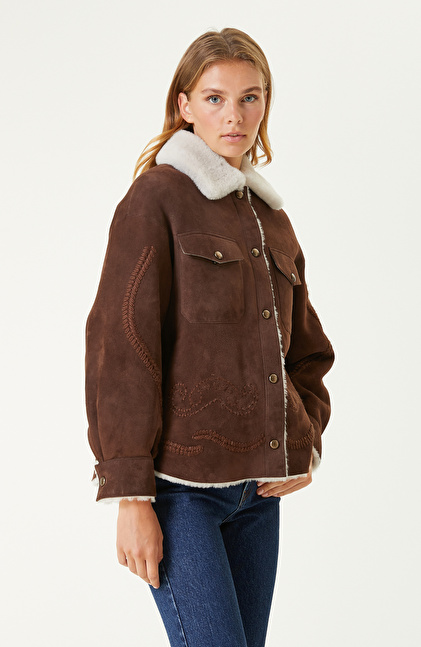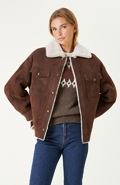 Regular Fit; Gömlek Yaka; Uzun Kol; Süet Deri Mont; Nakış İşlemeli; Yan Cepli