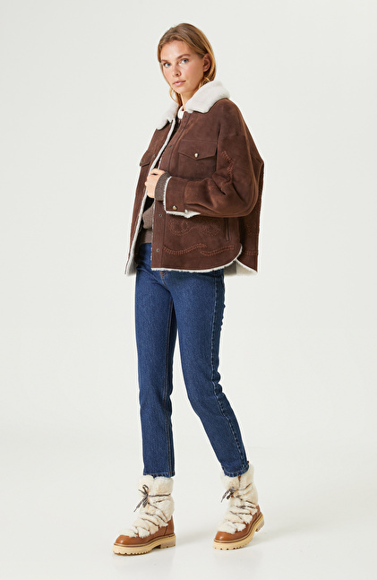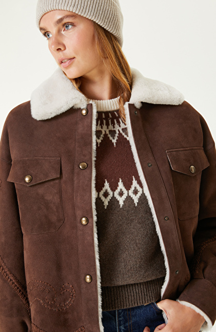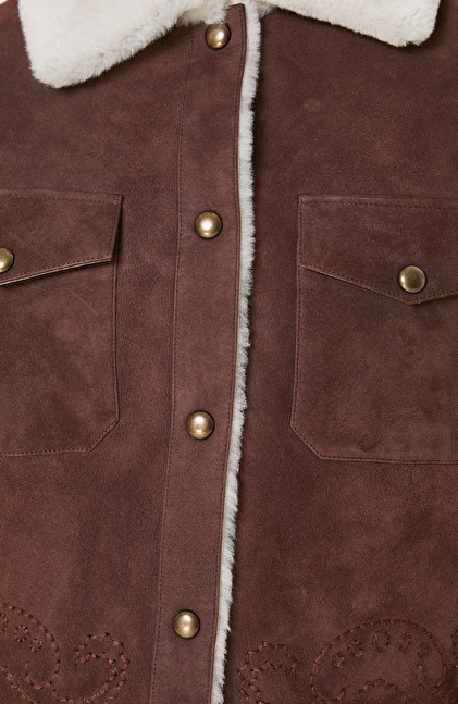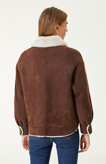 Kahverengi Nakış İşlemeli Suet Deri Mont