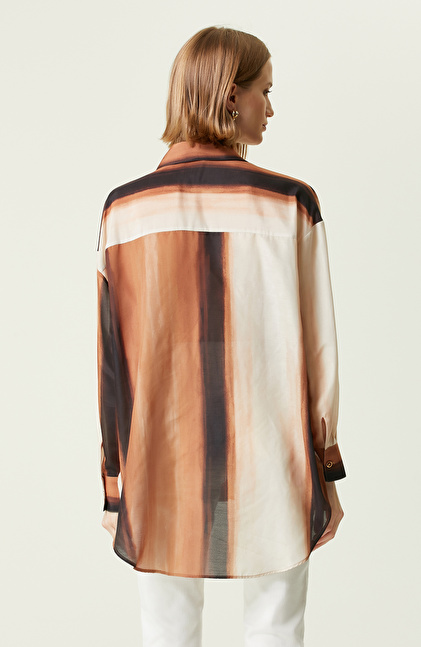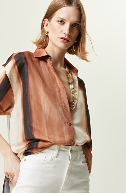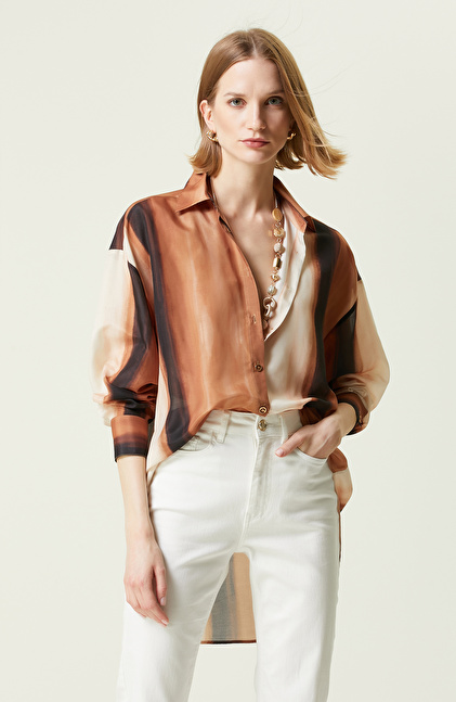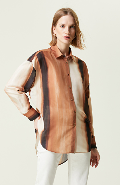 Şık giyinmeye özen gösteren NetWork kadınının yaz sezonu kombinlerine dahil olan Kahverengi Uzun Kollu Gömlek, dokuma kumaşlı olarak tasarlanır ve yumuşacık bir hissiyat yaratır. Down to Earth koleksiyonunun smart casual tarzını vurgulayan degrade kahverengi gömlek, regular fit tasarımı ile iddialı görünmenin yanı sıra konforlu bir deneyime sahiptir. Uzun kol ve gömlek yaka detayları taşıyan parça, serin ilkbahar akşamlarında tercih edilebilir. Desenli uzun kol gömleği; denim pantolon, ince suni deri ceket, toprak tonlarında ince bantlı bir ayakkabı, altın renkli takı ve aksesuarlarla kullanabilir ve etkileyici auranızı dışa yansıtabilirsiniz.