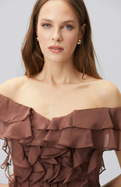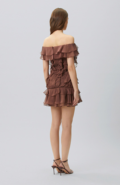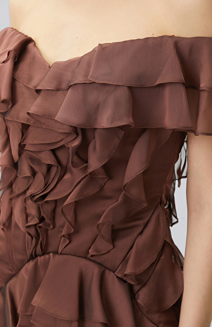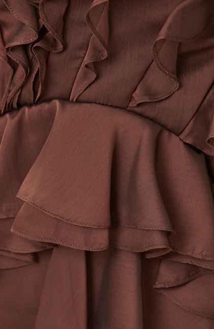 Kahverengi Volanlı Mini Abiye Elbise