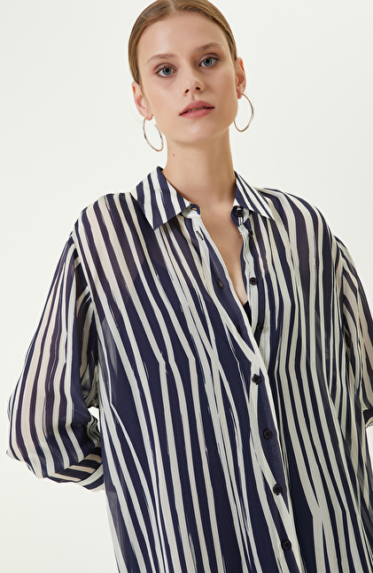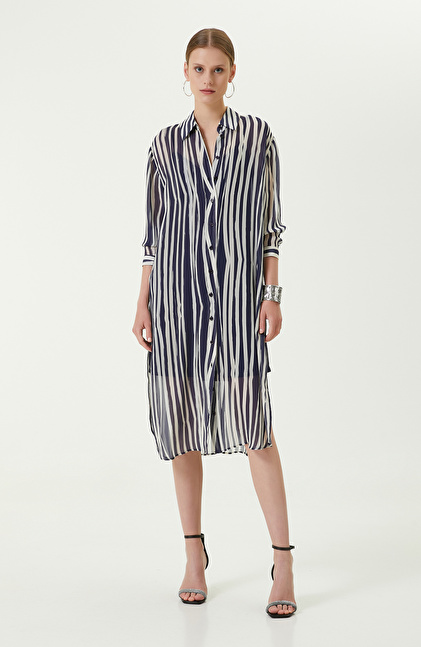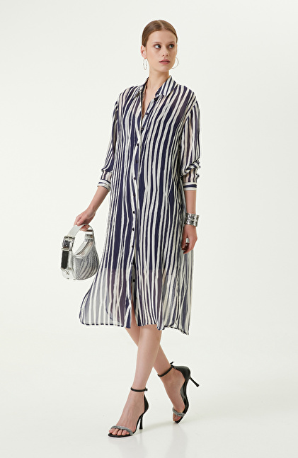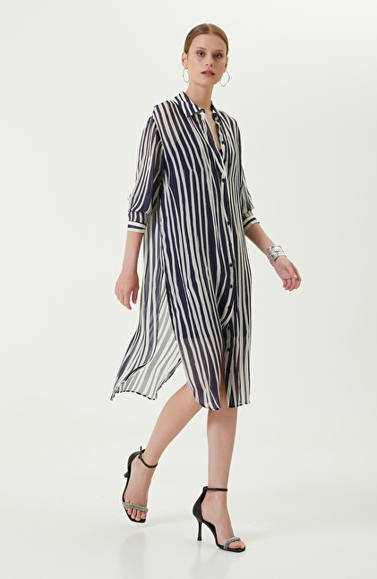 Dikey çizgileri ile zamansız ve her zaman şık görünüm hedefleyen kadınlara hitap eden Kemerli Lacivert Midi Boy Elbise, NetWork'ün lüks ve çok yönlü tasarım çizgisini mükemmel bir şekilde yansıtır. Önden düğmeli lacivert beyaz çizgili elbise, kolaylıkla giyilip çıkarılabilir ve kombine göre ayarlanabilir. Yanlarda yer alan derin yırtmaçlar ise çekici görünüm elde etmenize yardımcı olurken aynı zamanda rahat etmenizi sağlar. Yumuşak ve hafif kumaşı, sonbahar kombinlerinde katmanlama yapabilmeniz ve ceketlerle eşleştirmeniz için idealdir. Siz de lacivert elbiseyi; beyaz blazer ceket, beyaz stiletto, açık mavi el çantası ve altın renkli takılarla kombinleyebilir, gündelik kış görünümlerinize lüks detaylar ekleyebilirsiniz.