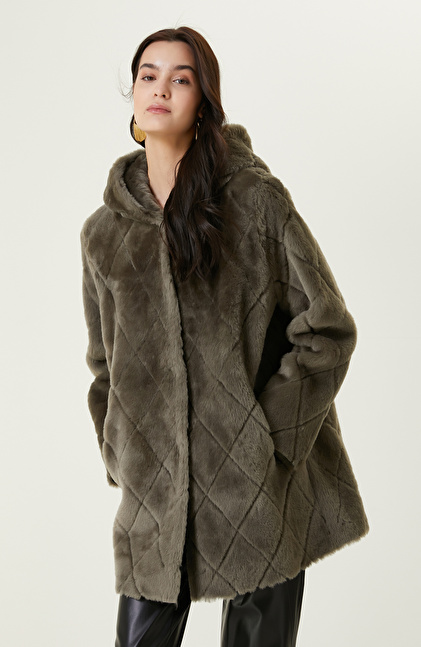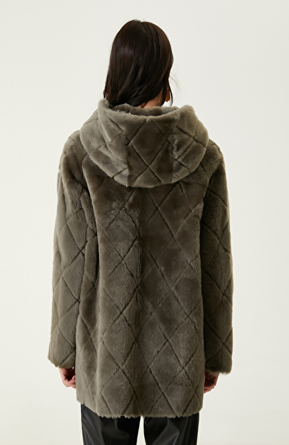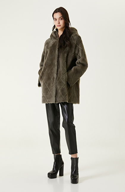 Kesik Çizgi Detaylı Açık Haki Deri Kaban