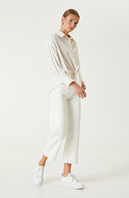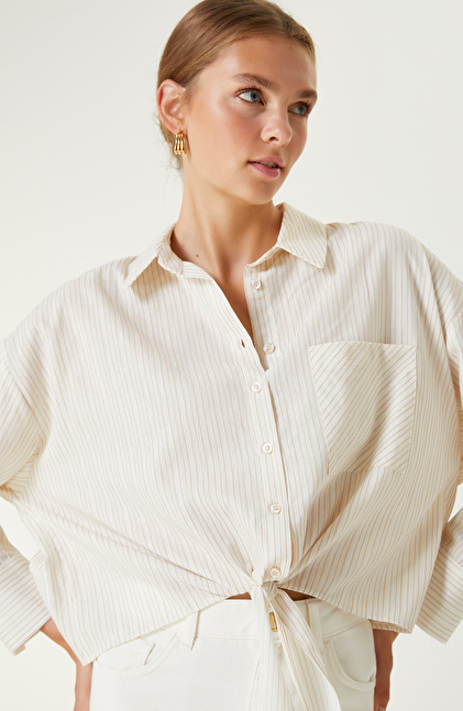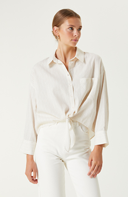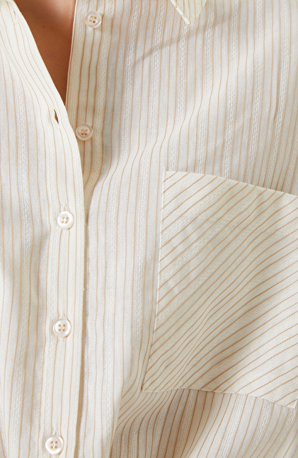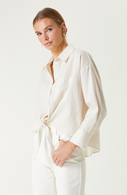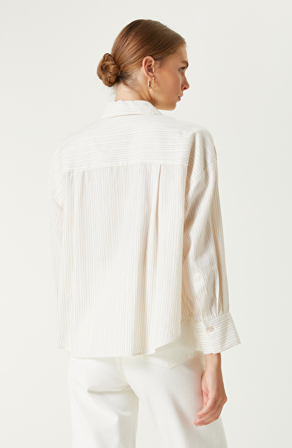 Kırık Beyaz Bej Çizgi Desenli Gömlek