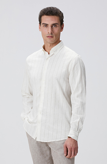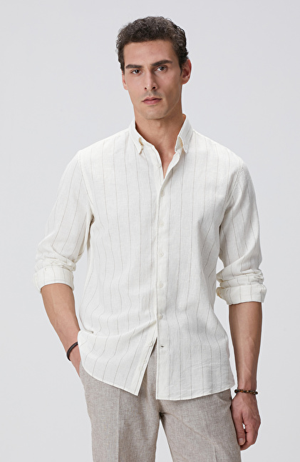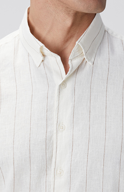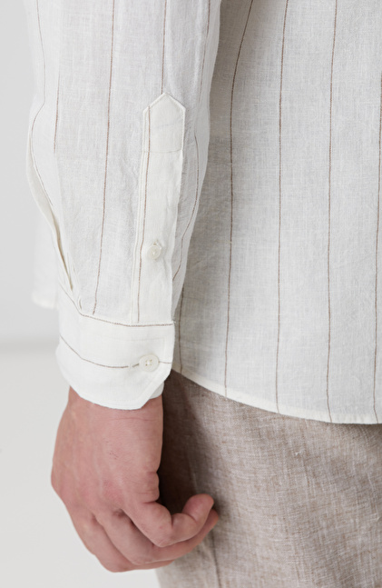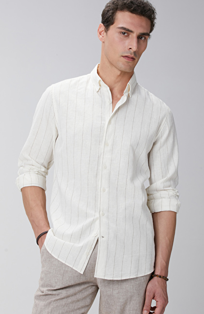 Kırık Beyaz Çizgi Desenli Keten Gömlek