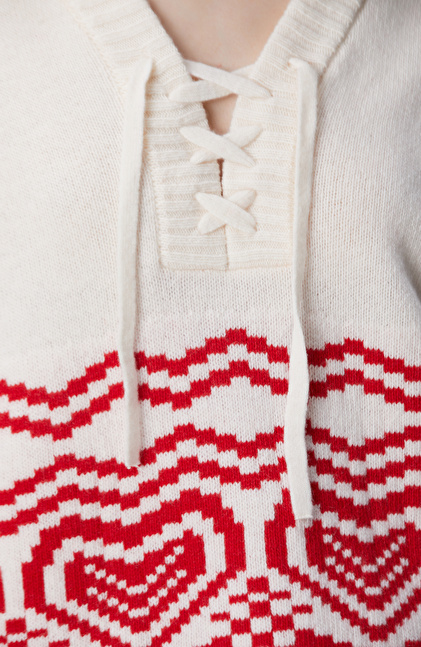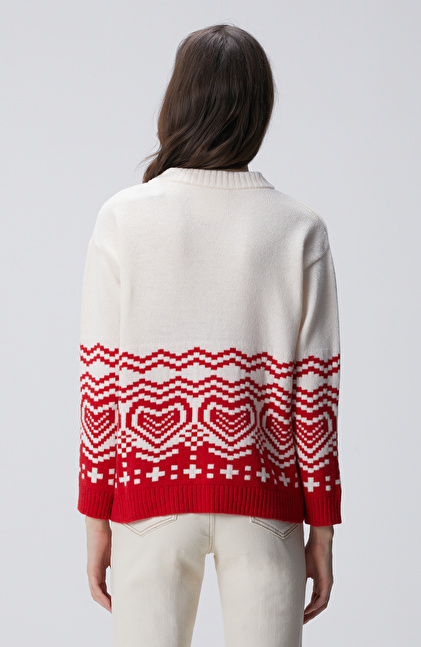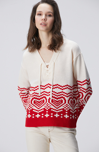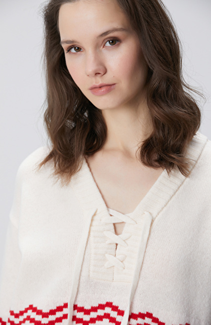Kırık Beyaz Desenli Yün Karışımlı Triko Kazak