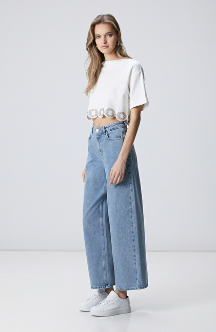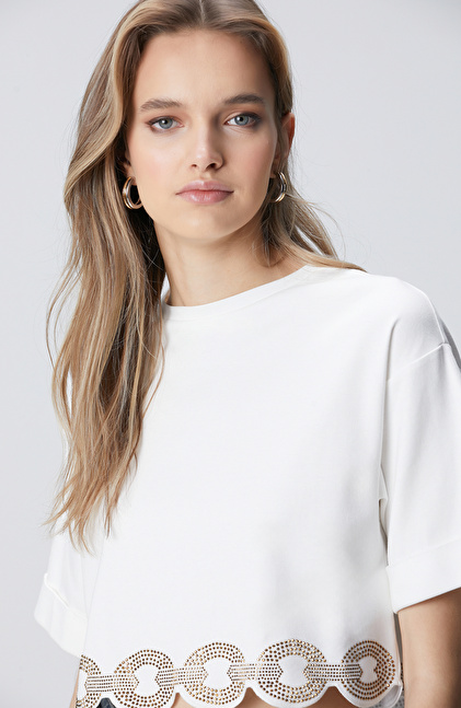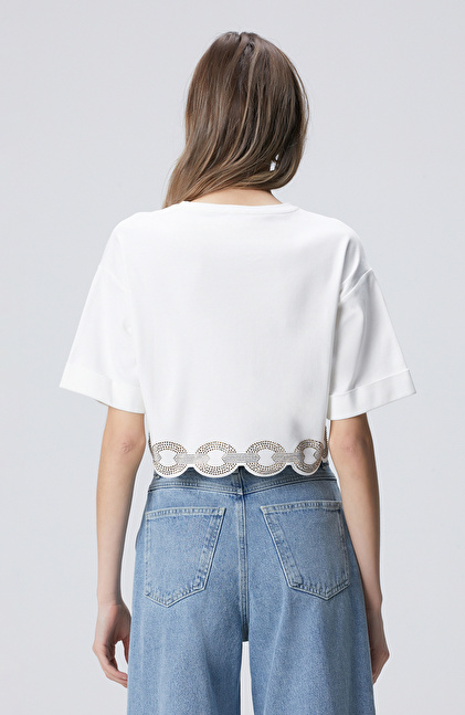Kırık Beyaz Etek Ucu Taş Baskılı T-shirt