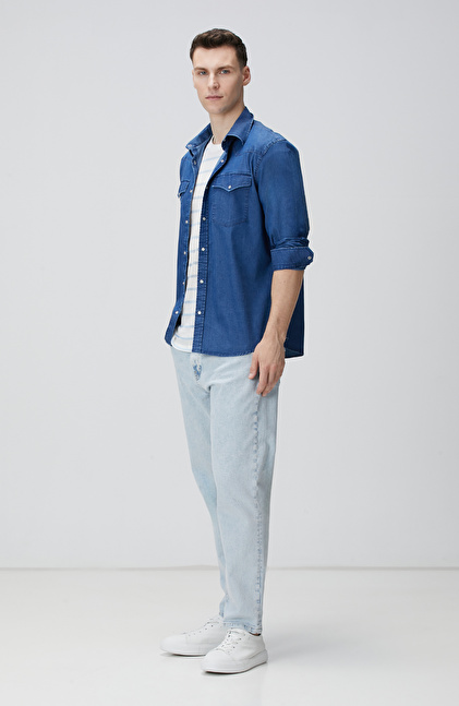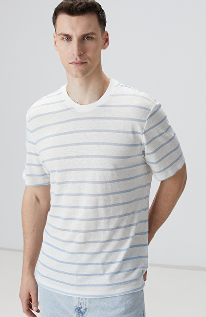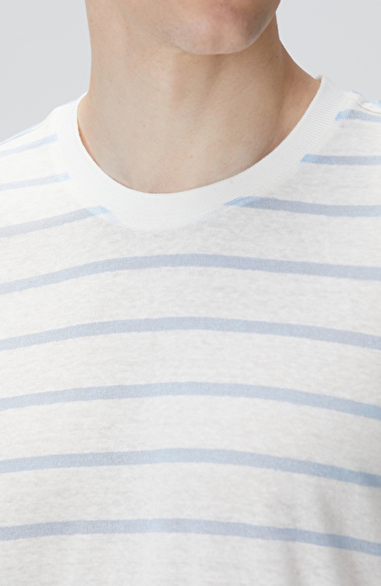 Kırık Beyaz Mavi Keten Karışımlı T-shirt
