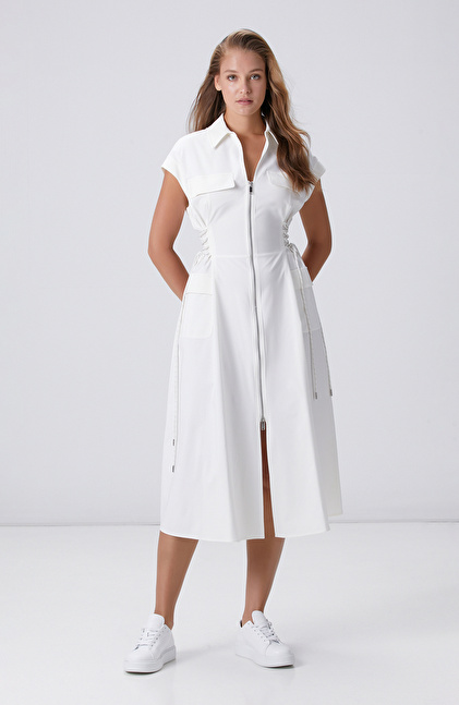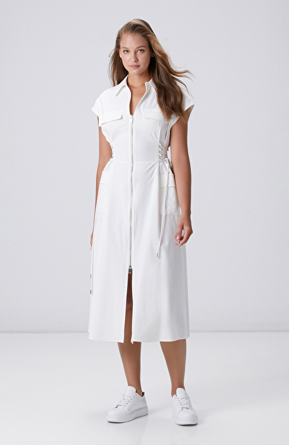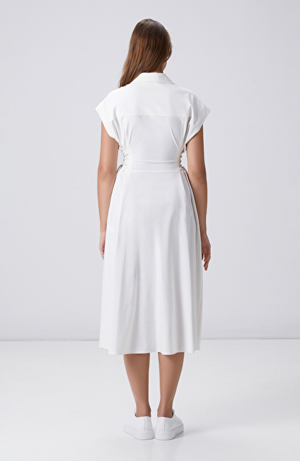 Kırık Beyaz N-tech  Bel Detaylı Midi Elbise