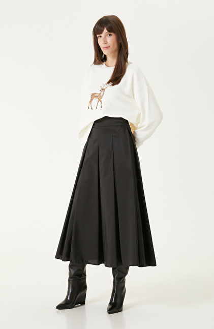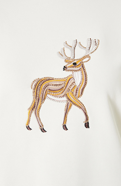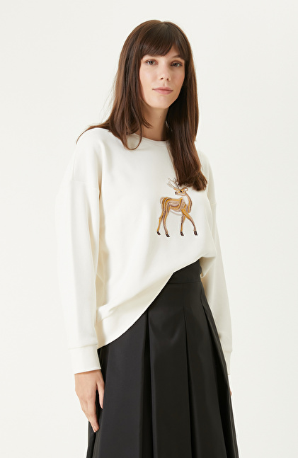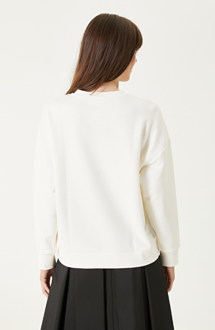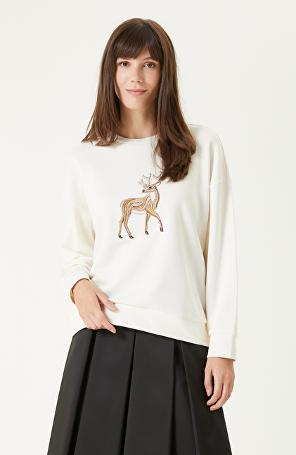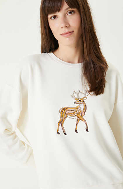 Kırık Beyaz Nakışlı Taş İşlemeli Sweatshırt