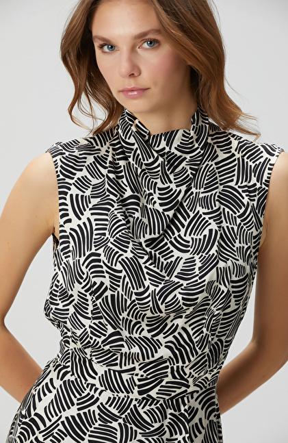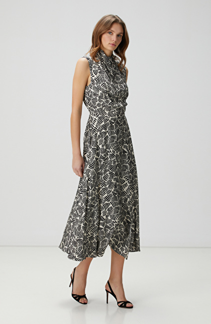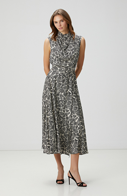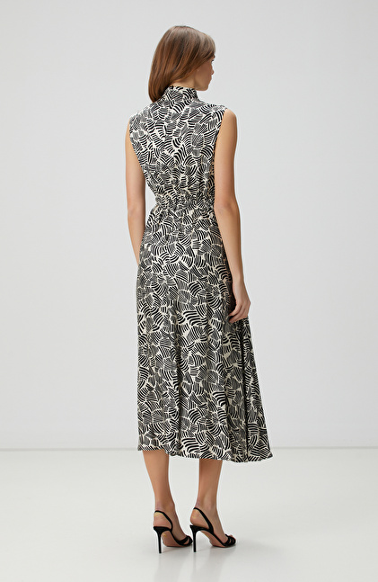 Kırık Beyaz Siyah Desenli Midi Elbise