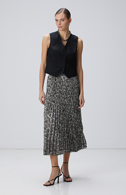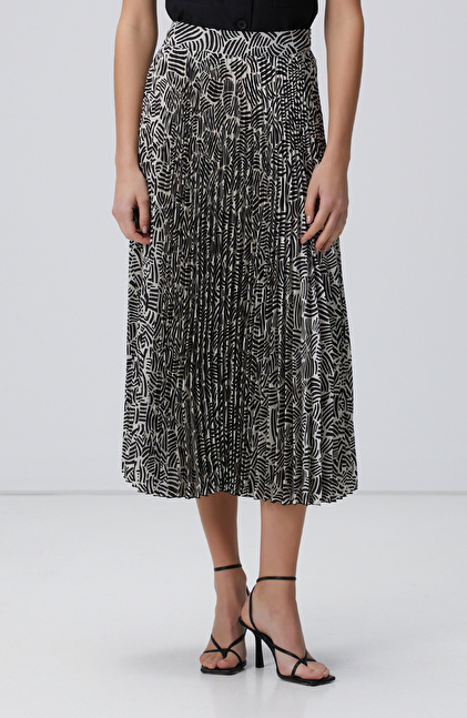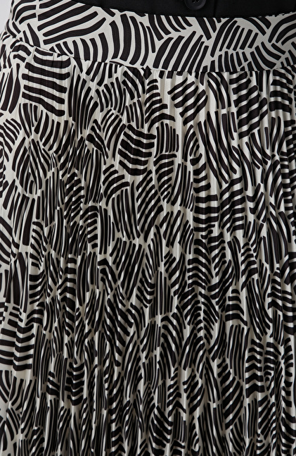 Kırık Beyaz Siyah Desenli Midi Etek