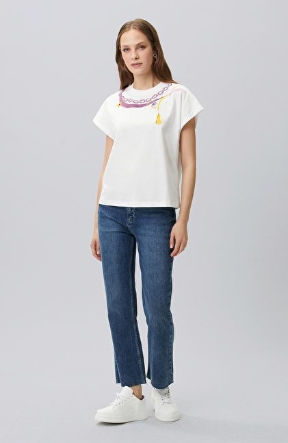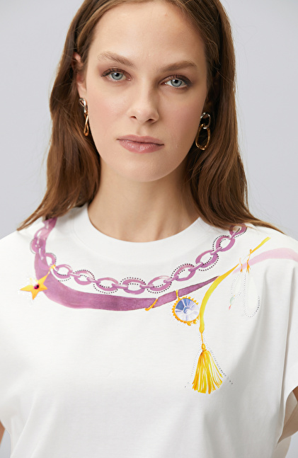 Kırık Beyaz Yaka Baskı Detaylı T-shirt