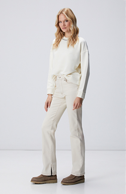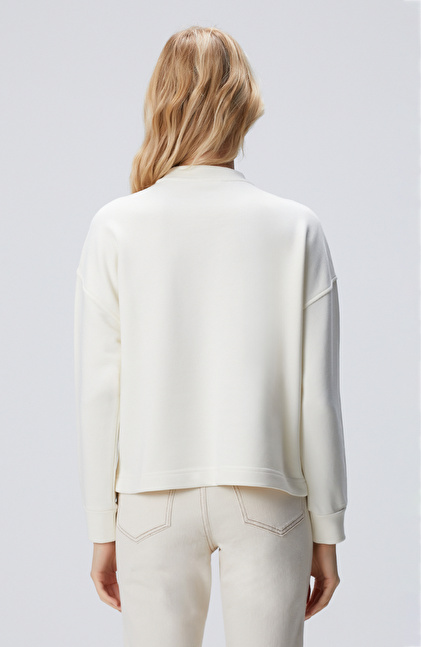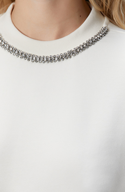 Kırık Beyaz Yakası Taş İşlemeli Sweatshirt