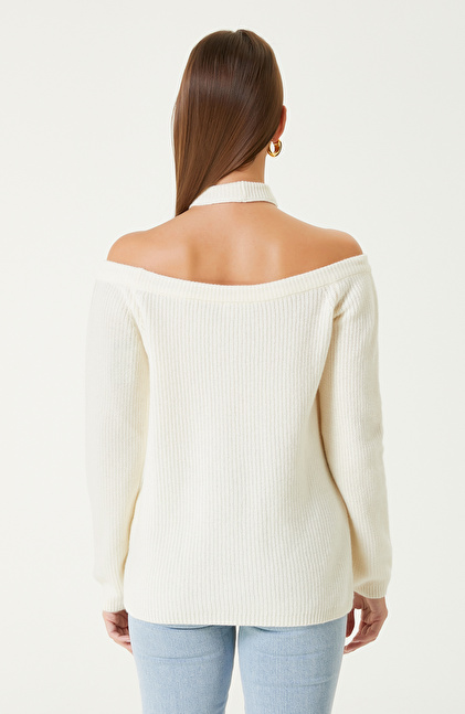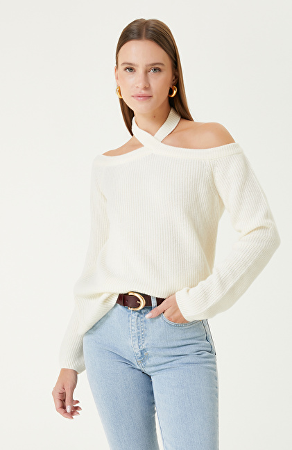 Kırık Beyaz Yün Karışımlı Çapraz Yakalı Triko Kazak