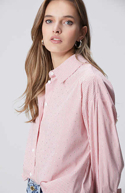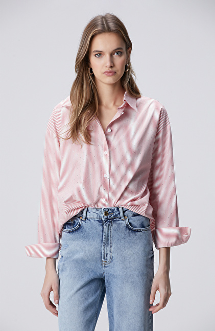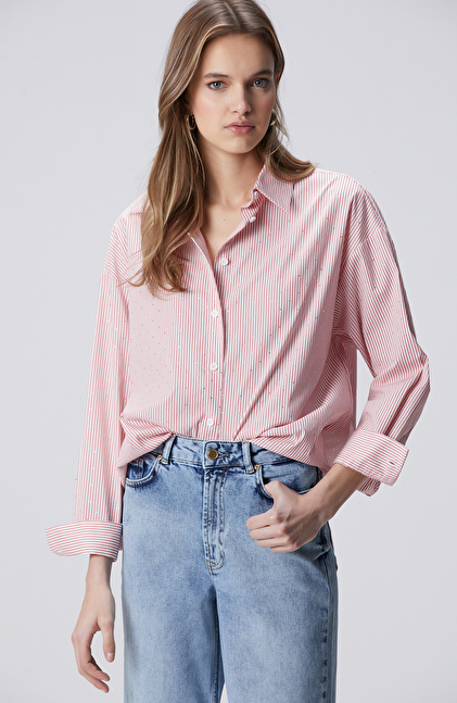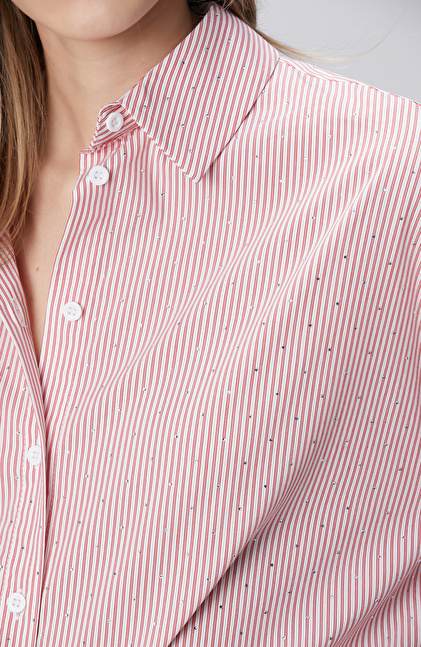 Tükenmek Üzere Kırmızı Beyaz Çizgili Taş Baskılı Gömlek
