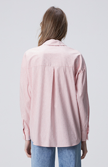 Kırmızı Beyaz Çizgili Taş Baskılı Gömlek