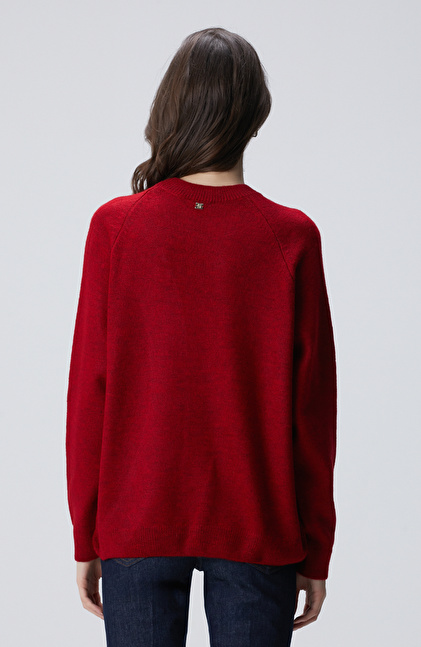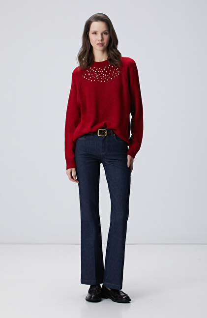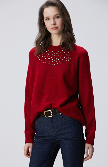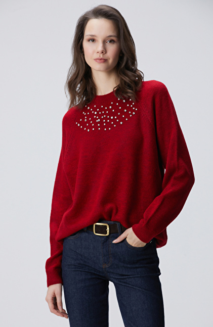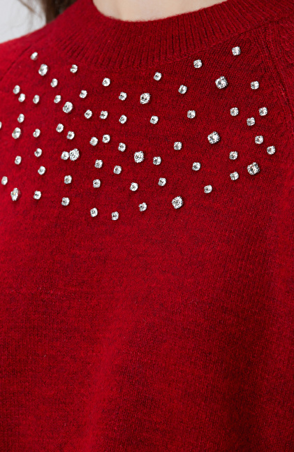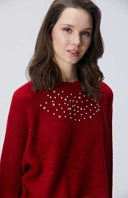 Kırmızı Bisiklet Yaka Taş İşlemeli Kazak