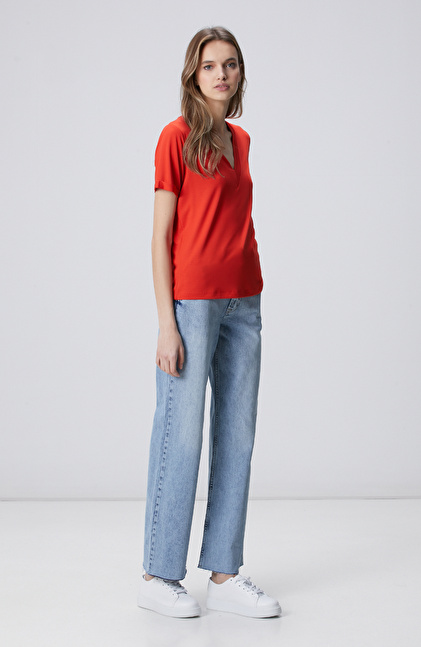 Kırmızı Kol Katlama Detaylı Basic T-shirt