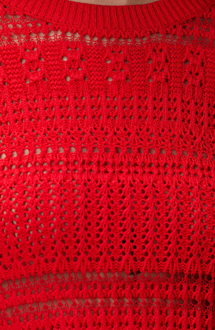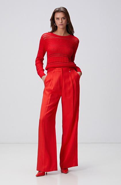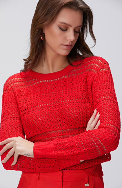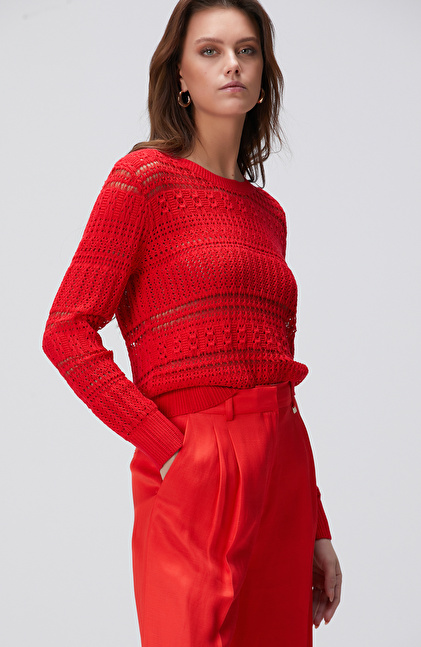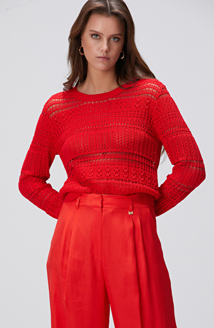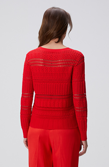 Kırmızı Örgü Detaylı Triko Kazak