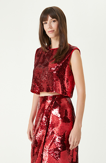 Regular Fit; Bisiklet Yaka; Kolsuz; Payetli Crop Bluz