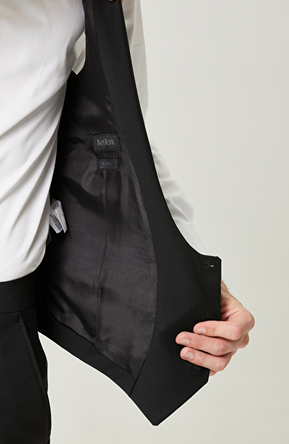 NetWork'ün koleksiyonunun Business serisinde öne çıkan Kolsuz V Yaka Siyah Smokin Yeleği, seremoni ve düğün gibi özel davet kombinlerine eşlik eden lüks parçalardan biridir. Smokinleri mükemmel şekilde tamamlayan yelek, kolsuz tasarımı ve derin V yakası sayesinde stil sahibi erkeklerin favorisidir. Slim fit smokinlere tam uyum sağlar ve düz paçası Oxford ve Brogue ayakkabılarla kombinlemek için idealdir. Fleto cebi ise smokin ceketlerin fit görünümünü destekler. Arka kısmında bulunan ayarlanabilir kemer, yeleği ölçülerini göre fit şekilde ayarlamanıza izin verir. Siz de smokin yeleğini; beyaz saten gömlek ve smokin takımı ile birlikte giyebilir, kırmızı papyon, siyah rugan Brogue ayakkabılarla düğün kombini yapabilirsiniz.