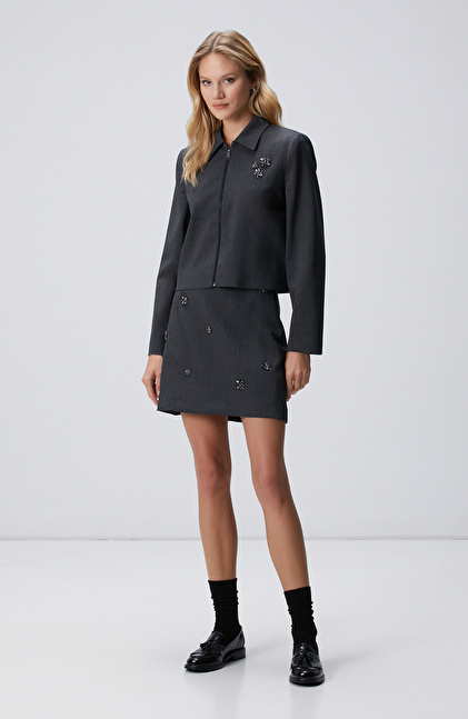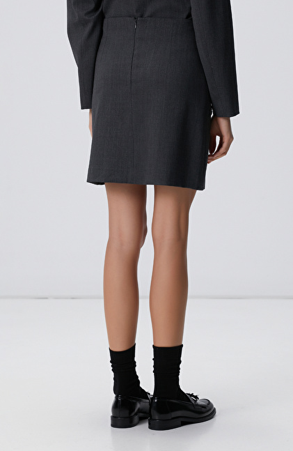 Koyu Gri Yün Karışımlı Mini Etek