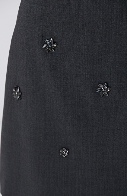 Evaze; Yüksek Bel; Yün Karışımlı; Mini; Dokuma Etek; Taşlı; Cepsiz