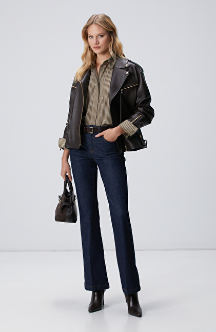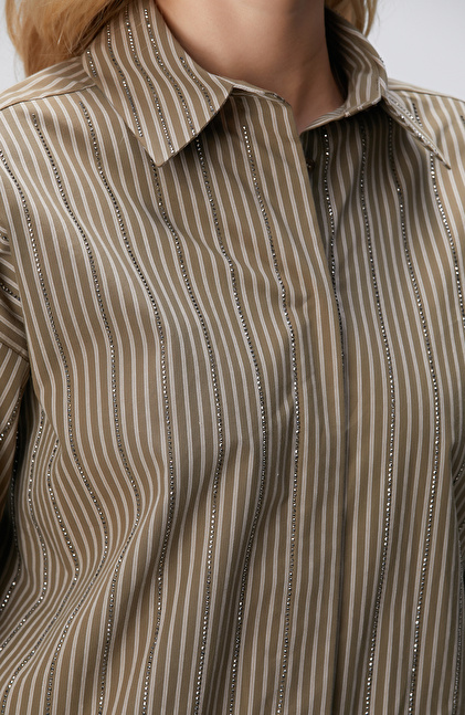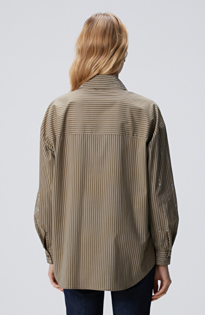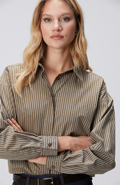 Koyu Haki Çizgi Desenli Oversize Gömlek