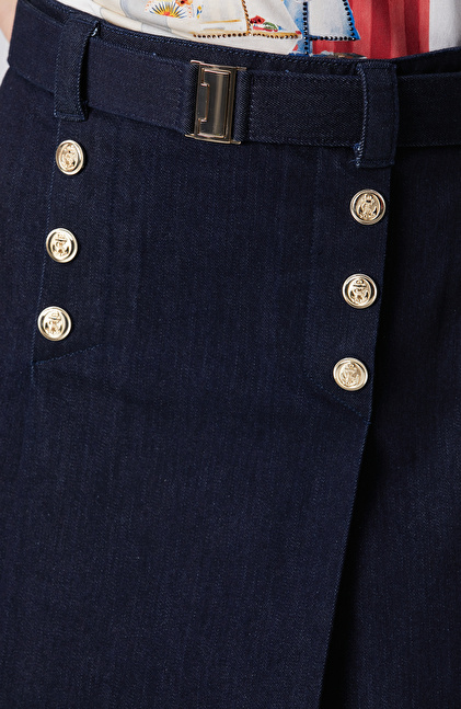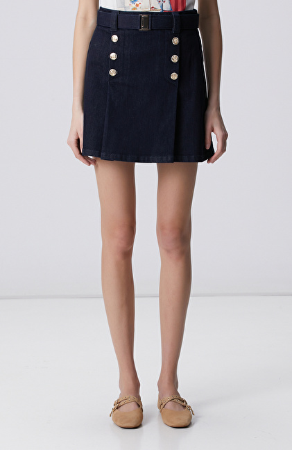 Regular Fit; Normal Bel; Gold Düğmeli; Kemer Detaylı Denim Etek; Mid Boy; Pile Detaylı; Cepsiz