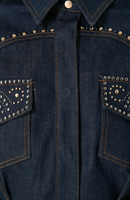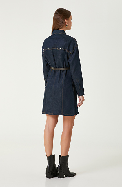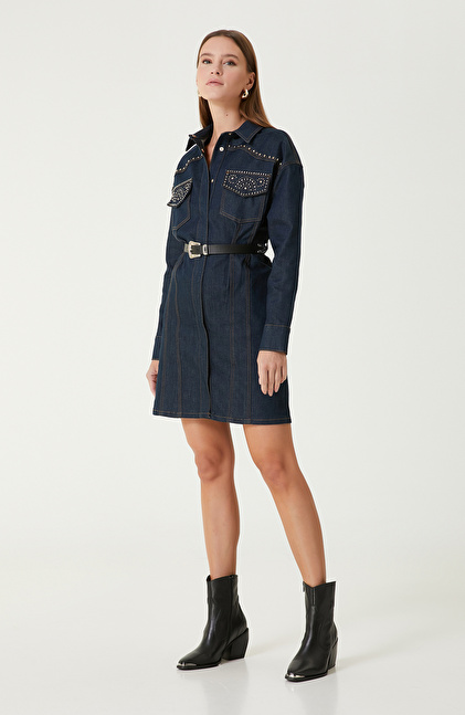 Koyu Indigo Mavi Trok Detaylı Denim Elbise
