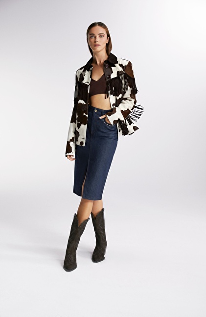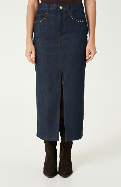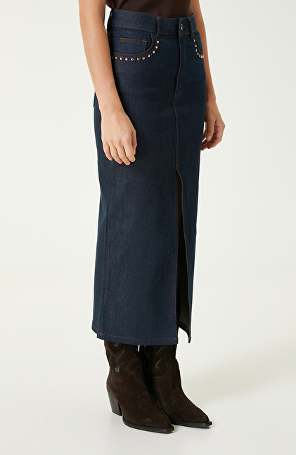 Koyu Indigo Mavi Trok Detaylı Denim Etek